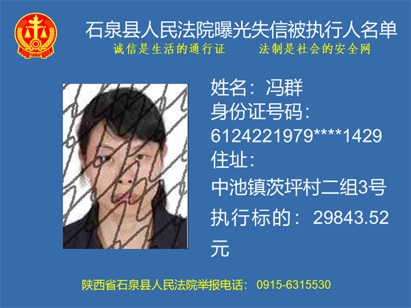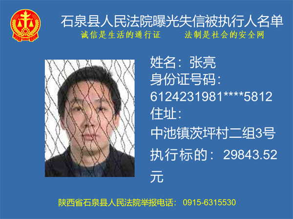 為了進一步加大執(zhí)行力度,保障勝訴當事人的合法權益,推進社會誠信體系建設,依照《中華人民共和國民事訴訟法》、《最高人民法院關于公布失信被執(zhí)行人名單信息的若干規(guī)定》等法律、司法解釋的有關規(guī)定,現(xiàn)對一批已進入執(zhí)行程序,且尚未全部履行義務的被執(zhí)行人進行媒體曝光,歡迎廣大群眾支持石泉縣人民法院的工作,向我院提供被執(zhí)行人的財產(chǎn)線索,使生效法律文書能夠得到切實執(zhí)行,讓人民群眾切實感受到公平正義就在身邊。