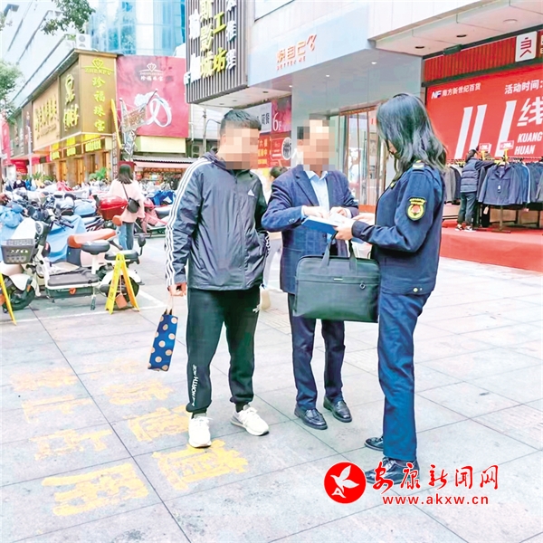 11月6日,漢濱區(qū)城管執(zhí)法人員在金州路開展糾治隨地吐痰專項執(zhí)法,對隨地吐痰人員提示改正,并根據(jù)相關(guān)規(guī)定進行處罰。市創(chuàng)文辦供圖……