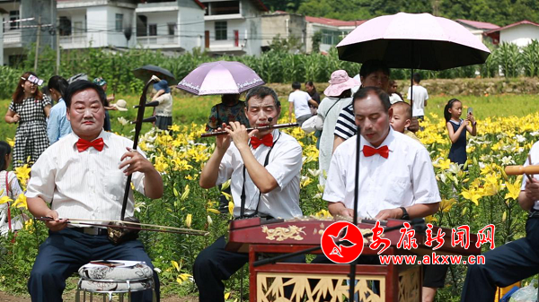 主辦方在整片花園設(shè)置了不同主題的賞花區(qū)域,供游人欣賞拍照。以愛為主題的紅色百合花海中,有村里的金婚老人正在拍攝寓意百年好合的浪漫婚紗照;在花田書法主題園中,有知名書法家正在揮毫有關(guān)百合的詩詞,引得眾多游人駐足觀看。各村村民和南山燕公司還布設(shè)了展位,推介銷售地方農(nóng)特產(chǎn)品及手工藝品。