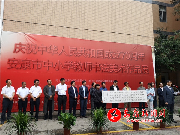本網(wǎng)訊(實(shí)習(xí)記者 雷文鈺)為慶祝中華人民共和國成立70周年,安康市中小學(xué)教師,用一份特殊的禮物向偉大的祖國獻(xiàn)禮,9月24日上午,由安康市教育體育局主辦,安康市教研室、陜西省安康中學(xué)、安康市教育學(xué)會(huì)、安康市中小學(xué)美術(shù)教育研究會(huì)承辦,安康市書法家協(xié)會(huì)、安康市群藝館、陜西省于右任書法學(xué)會(huì)安康分會(huì)、陜南畫院協(xié)辦的“輝煌七十載,筑夢新時(shí)代”慶祝新中國成立七十周年安康市中小學(xué)教師書法美術(shù)作品展在安康中學(xué)美術(shù)館啟幕。