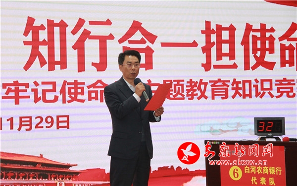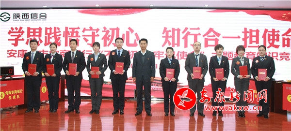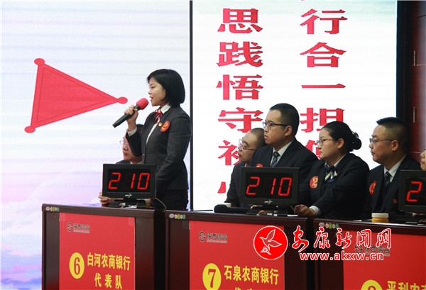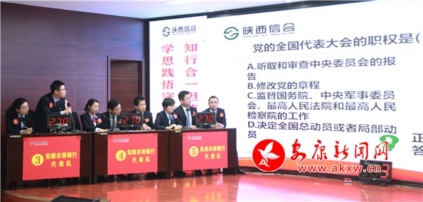據(jù)了解,本次活動以“學思踐悟守初心,知行合一擔使命”為主題,以習近平新時代中國特色社會主義思想、黨的十九屆四中全會精神、黨章黨規(guī)、掃黑除惡專項斗爭應知應會知識等為競賽內容,設置必答、搶答、風險、加試等環(huán)節(jié)進行,來自安康各縣區(qū)農(nóng)商行10個代表隊,共30名選手參與競答。賽場上,氛圍緊張激烈,你追我趕,尤其在搶答題環(huán)節(jié),搶答令一經(jīng)發(fā)出,各隊選手立即開始爭相搶拍競答器,比分稍微落后的隊伍在搶到答題權后,出色作答后贏得現(xiàn)場陣陣掌聲,即使答錯,選手們也毫不氣餒,互相鼓勵,立即調整狀態(tài)準備下一次搶答。比賽現(xiàn)場精彩紛呈,觀眾不時為選手們精準的回答報以熱烈的掌聲。