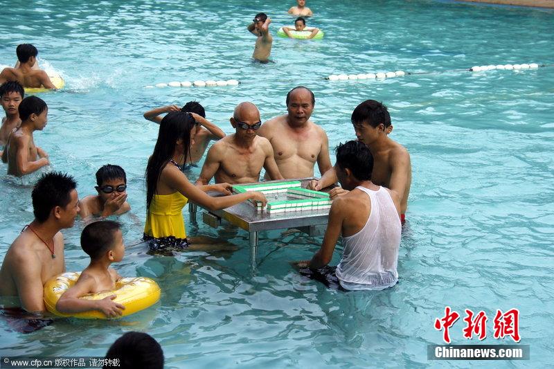 消暑?yuàn)蕵穬刹徽` 游客泳池打麻將