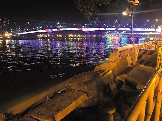 從市民拍攝的照片上可以看到,珠江邊的花崗巖欄桿被撞碎一地,不少市民前去圍觀,機(jī)船就停在江邊。