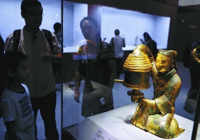 這些“課本文物”中,最難請的當(dāng)屬長信宮燈。這件西漢時期的青銅器,出土于中山靖王劉勝妻竇綰墓。展柜中,跽坐的宮女神態(tài)恬靜,她一手執(zhí)燈,另一手袖似在擋風(fēng),袖子實為虹管,用以吸收油煙,既防止了空氣污染,又有審美價值。因為宮燈曾放置于竇太后的長信宮內(nèi)而得名!斑@件文物已經(jīng)有段時間沒出過河北了,它是河北省博物館的鎮(zhèn)館之寶!