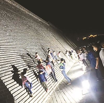 北京青年報(bào)記者在網(wǎng)友提供的照片中看到,正定古城墻外壁的墻磚間形成了一級(jí)級(jí)兩三厘米寬的小臺(tái)階,十幾個(gè)孩童側(cè)著身子、徒手攀爬至兩三米高處,家長(zhǎng)們站在城墻下給孩子拍照,而一旁“禁止攀爬”的警示牌則被無視。更有成年攀爬者在沒有保護(hù)措施的情況下,徒手攀爬至六七米高。眾多游客攀爬城墻,遠(yuǎn)看好似攻城,甚至讓部分游客誤以為這是該旅游景點(diǎn)的游樂項(xiàng)目。