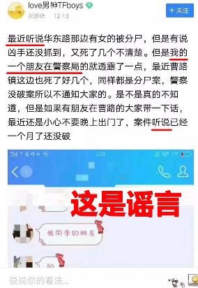 現(xiàn)經(jīng)浦東警方查證,“川沙曹路地區(qū)發(fā)生多起碎尸案”的始發(fā)網(wǎng)民“LOVE男神TFboys”為女中學(xué)生張某。其于12月13日晚與同學(xué)在網(wǎng)上聊天時(shí)得知所謂“華東路附近有個(gè)女子被分尸,兇手到現(xiàn)在還沒抓住”的消息,未核實(shí)該信息的真實(shí)性便在百度貼吧內(nèi)發(fā)布了上述內(nèi)容。后張某感覺被騙,遂于12月15日晚刪除該帖。此后有部分網(wǎng)民將其內(nèi)容截圖發(fā)布至新浪微博,造成該謠言進(jìn)一步擴(kuò)散。