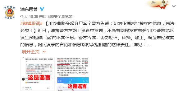 近日,浦東警方在開展網(wǎng)上巡查中發(fā)現(xiàn),不斷有網(wǎng)民在百度帖吧、新浪微博等社交平臺內(nèi)發(fā)布有關(guān)“川沙曹路地區(qū)發(fā)生多起碎尸案”的不實(shí)信息。