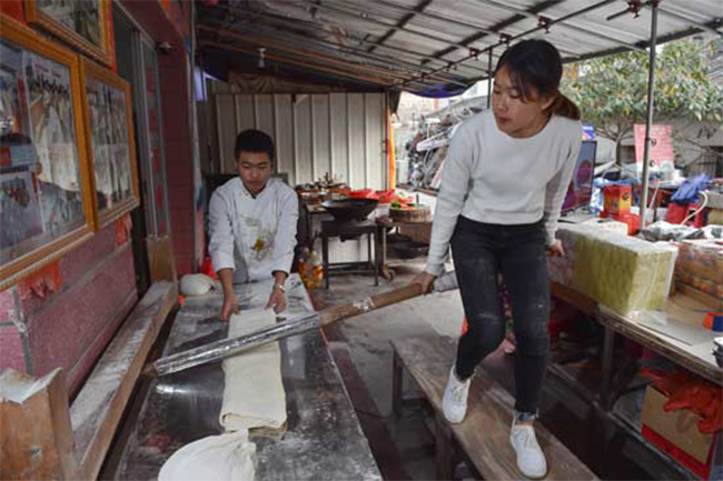 1月3日,郭煒蘭(右)騎在一根1米多長、碗口粗的搟面杖上,上下跳動,用身體的力量將另一端的面團(tuán)壓成扁條形,這就是“騎木杖”搟面。