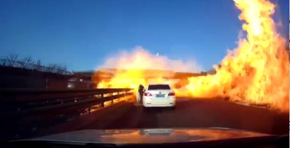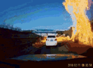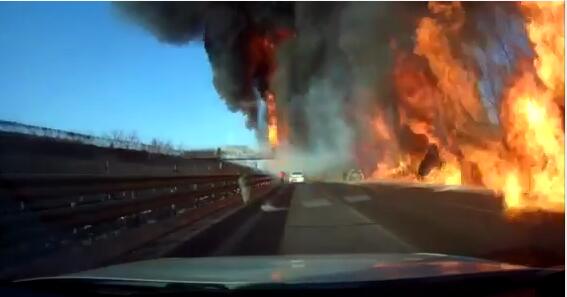 網(wǎng)傳行車記錄儀的視頻顯示,2月11日8時許,前方高速公路上有一輛油罐車側(cè)翻在地,記錄儀所在車輛停在路中,女司機(jī)說“后面(車)不倒我咋倒(車)”。此時右前方一輛小汽車往油罐車方向開了一點(diǎn),正待倒車,突發(fā)巨響,車底爆燃,一瞬即被迅速蔓延的火焰吞沒。而正前方白色小汽車司機(jī)棄車急速向后奔跑。隨即行車記錄視頻中傳來所在車中女子的尖叫哭泣聲,有男子催促倒車加油,另有女子安慰。隨著記錄儀所在車輛緊急倒退,視頻中可見高速路旁樹木綠地成片燃燒,火光沖天。倒車約30秒后,這輛車終于離開了起火范圍。