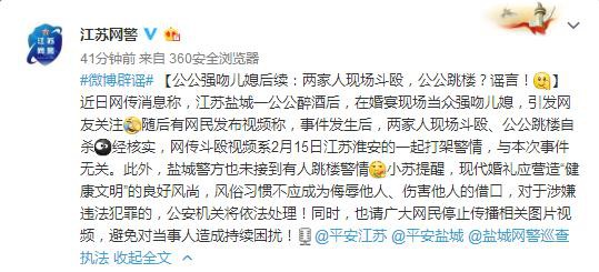 2月26日9時3 3分,江蘇省公安廳網(wǎng)絡(luò)安全保衛(wèi)總隊官方微博“江蘇網(wǎng)警”對此辟謠,“經(jīng)核實,網(wǎng)傳斗毆視頻系2月15日江蘇淮安的一起打架警情,與本次事件無關(guān)。此外,鹽城警方也未接到有人跳樓警情!
