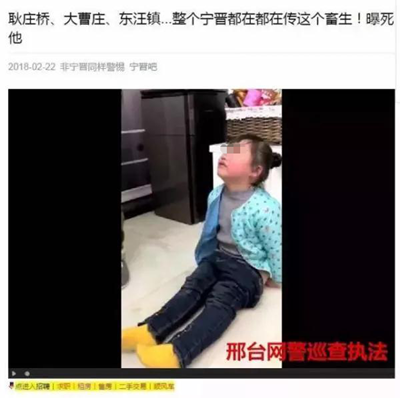 隨后,“父親打女兒”的視頻配上了“某地都在傳這個畜生!曝死他”等標題在各地的微信群、自媒體平臺瘋狂傳播,并配文稱視頻內(nèi)的父親是當?shù)厝,呼吁當(shù)厝罕娨黄饘ふ疫@位虐童父親。