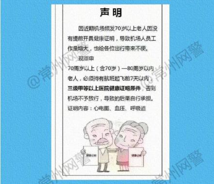 2月11日,常州網(wǎng)警辟謠稱,此消息不準確。根據(jù)《中國民用航空旅客、行李國內(nèi)運輸規(guī)則》,對于老年人乘坐飛機,并沒有年齡上的特殊限制。實際上,各航空公司的規(guī)定并不一樣。