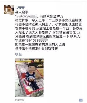 近日,多地網(wǎng)民轉(zhuǎn)發(fā)圖片稱“今天上午寧繼春的三歲女兒在錦繡花園小區(qū)附近被人拐走了,女兒能說出她爸爸的手機號碼……從監(jiān)控上看,小女孩是被一個四十多歲男人抱走了,現(xiàn)大人都急瘋了,有知情者請告之。萬分感謝……”
