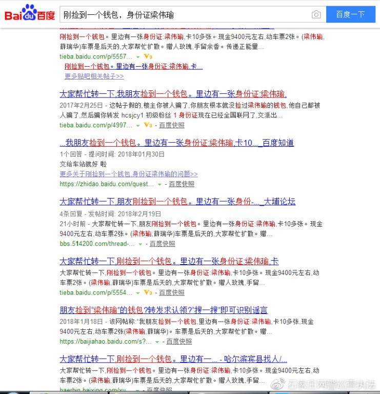 但是,經(jīng)警方調(diào)查,網(wǎng)傳消息中的聯(lián)系電話一直無法接通。該手機號碼的歸屬地顯示為廣東深圳,并被多個用戶標記為騷擾電話。通過搜索發(fā)現(xiàn),這條“失物招領(lǐng)”在網(wǎng)絡(luò)上已經(jīng)流傳很久。除了失主的姓名“梁偉瑜”“薛瑞華”沒變之外,聯(lián)系人的電話號碼卻出現(xiàn)過多個版本,類似的“失物招領(lǐng)”虛假信息也有很多。網(wǎng)絡(luò)中流傳“徐俊峰”“劉馨心”等多人丟失錢包的網(wǎng)帖,同樣都被證明為謠言。可見,所謂的“失物招領(lǐng)”實際上是一條“陳年老謠”,只要把其中的姓名、聯(lián)系方式等信息進行替換,這條謠言便又能改頭換面,重新在網(wǎng)絡(luò)中流傳。