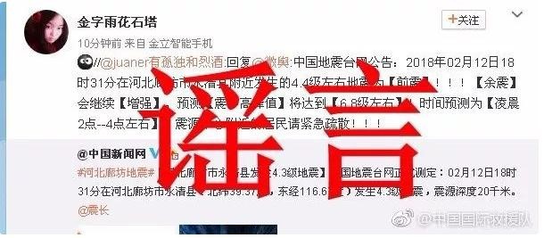 2月12日,河北永清地震發(fā)生不久后,網(wǎng)上有消息稱該縣“9958應(yīng)急救援隊接到通知,今晚11點30分有余震活動!12日19時57分,河北省廊坊市人民政府新聞辦官微“廊坊發(fā)布”對此辟謠稱,“純屬謠言,公安部門正在追查謠言的源頭,請廣大群眾勿信勿傳謠言,以權(quán)威發(fā)布為準!