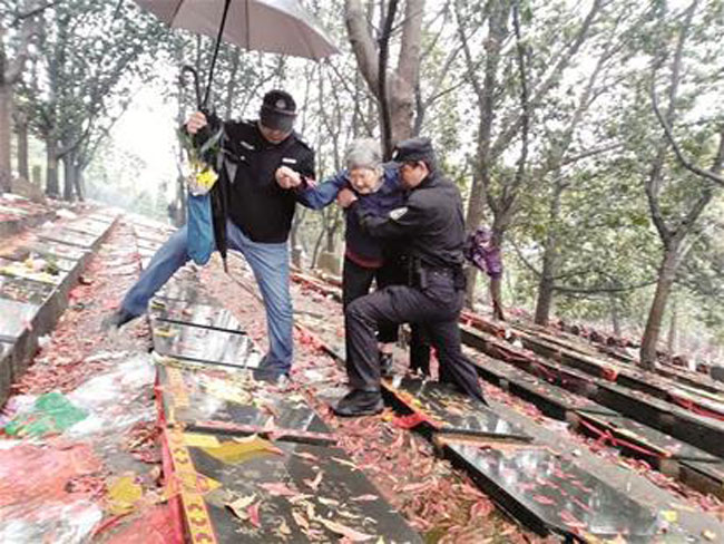 湖北武漢漢陽(yáng)永豐派出所協(xié)警潘正好介紹,當(dāng)日上午11時(shí)許,他和另外一名同事正在公墓內(nèi)巡邏執(zhí)勤時(shí),接到一女子求助,稱南九墓區(qū)有位老人滑倒。他們趕到現(xiàn)場(chǎng)后,先將老人攙扶上了巡邏車。