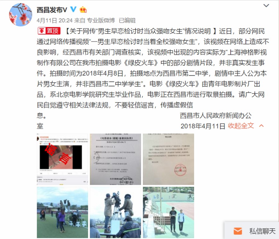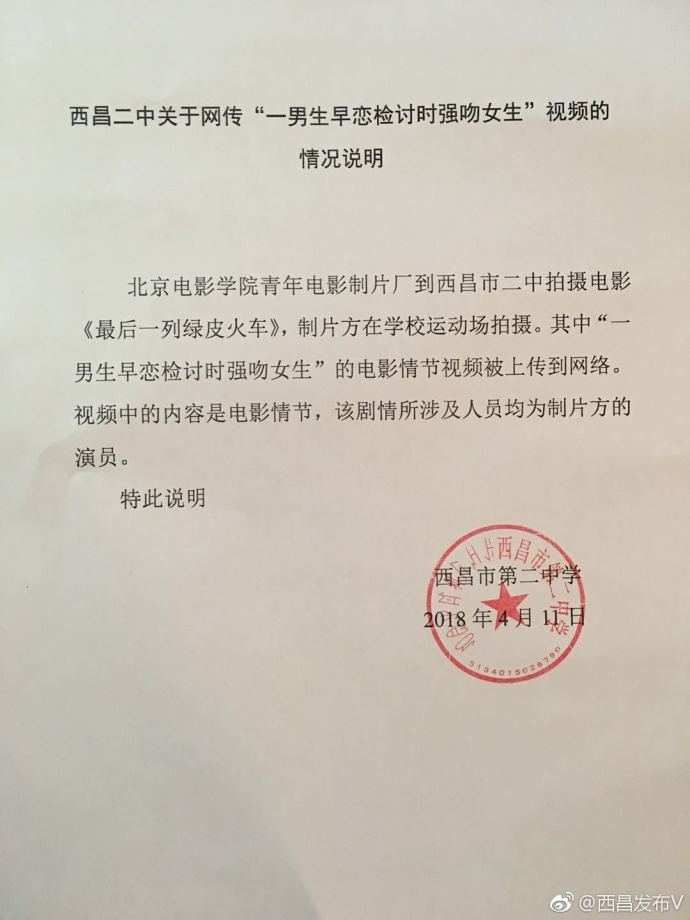 4月11日,西昌市政府新聞辦官微“西昌發(fā)布”發(fā)表對該視頻的情況說明。經(jīng)查,該視頻中出現(xiàn)的內(nèi)容實(shí)際為“上海一影視制作有限公司在西昌市拍攝某電影中的部分劇情片段,并非真實(shí)發(fā)生事件。拍攝時間為2018年4月8日,拍攝地點(diǎn)為西昌市第二中學(xué),劇情中主人公為本片男女主演,并非西昌市二中學(xué)學(xué)生”。并附圖“北京市新聞出版廣電局《電影劇本〈梗概〉備案回執(zhí)單》”、“西昌二中關(guān)于網(wǎng)傳‘一早戀男生檢討時強(qiáng)吻女生’視頻的情況說明”及在操場取景拍攝的照片。