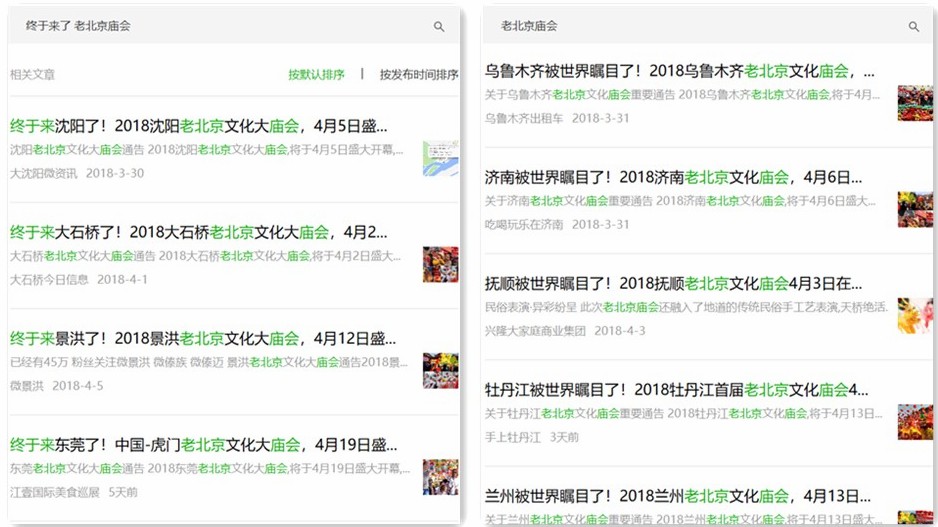 此類消息打出“高品質(zhì)的游玩盛會、高規(guī)格的城市經(jīng)典”的噱頭,聲稱“廟會門票免費送”,呼吁大家“隨手一曬到盆友圈,讓更多的人知道”,并且介紹了舞獅舞龍、二人轉、踩高蹺、民俗手工藝等等的廟會活動,鋪排了大量的美食照片,達到博人眼球的效果。