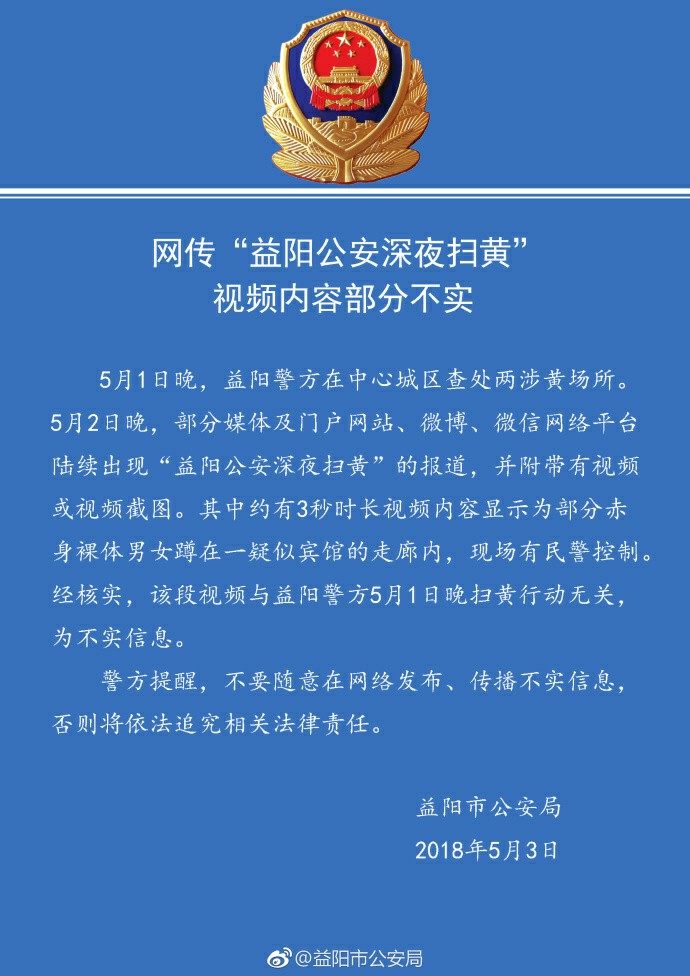 據(jù)益陽市公安局的情況通報(bào)稱,5月1日晚,益陽警方依法對(duì)涉嫌存在賣淫嫖娼違法犯罪活動(dòng)的資陽區(qū)某酒店、高新區(qū)某酒店進(jìn)行查處,現(xiàn)場(chǎng)查獲涉案嫌疑人員80余名。5月2日晚,部分媒體及門戶網(wǎng)站、微博、微信網(wǎng)絡(luò)平臺(tái)陸續(xù)出現(xiàn)“益陽公安深夜掃黃”的報(bào)道,并附帶有視頻或視頻截圖。其中約有3秒時(shí)長(zhǎng)視頻內(nèi)容顯示為部分衣冠不整的男女集中在一條走廊內(nèi),現(xiàn)場(chǎng)有民警控制。經(jīng)核實(shí),該段視頻與益陽警方此次掃黃行動(dòng)無關(guān),為不實(shí)信息。