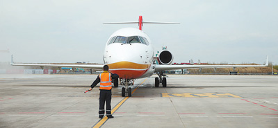 | 圖為5月2日,ARJ21—700新支線噴氣客機(jī)駛進(jìn)哈爾濱太平國際機(jī)場(chǎng)停機(jī)坪。(記者 丁汀 攝) |