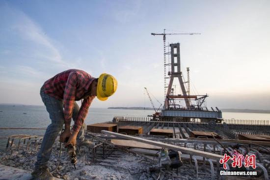一名工人在鄱陽湖二橋施工平臺上冒著高溫進(jìn)行施工。資料圖 傅建斌 攝