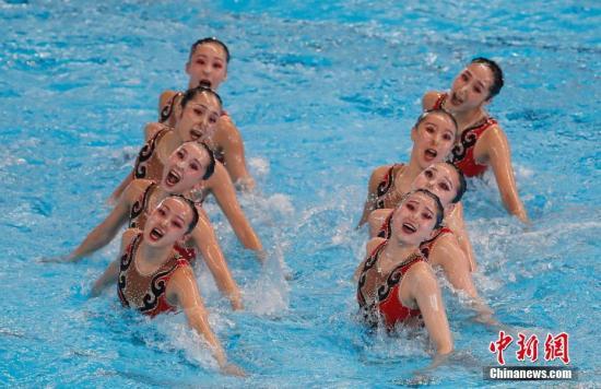 圖片說明:在8月29日下午結束的雅加達亞運會花樣游泳集體自由自選比賽中,中國隊憑借《鳳舞國粹》的出色發(fā)揮,奪得金牌。中新社記者 杜洋攝