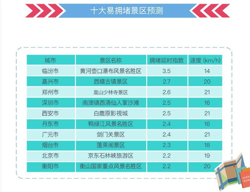報告顯示,十一期間周邊道路易擁堵景區(qū)排名前十中,黃河壺口瀑布風(fēng)景區(qū)周邊道路擁堵延時指數(shù)達(dá)3.5,平均車速僅為每小時14公里,成為國慶出行周邊道路最為擁堵的景區(qū)。西塘古鎮(zhèn)擁堵延時指數(shù)為2.7,排名第二,平均車速為每小時20公里;排在第三名的是嵩山少林寺景區(qū)以擁堵延時指數(shù)2.6,平均車速每小時21公里。