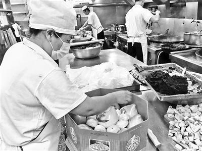 昨天上午,北京青年報(bào)記者在護(hù)國寺小吃起源店看到,普通的高筋面粉在李師傅和徒弟們的巧手下,經(jīng)過和面、塑形、蒸制、晾涼等多個(gè)制作工序后變成了一枚枚大壽桃。