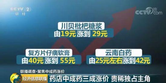 廣東省惠州市的一家藥店的負責人告訴記者,從年初開始,已經(jīng)有近三成的中成藥陸續(xù)漲價,川貝枇杷糖漿由原來的19元漲到了現(xiàn)在的29元,復(fù)方片仔癀軟膏由40元漲到55元,云南白藥現(xiàn)在的價格也已經(jīng)提到每盒42元,而去年的零售價還約在25元左右。