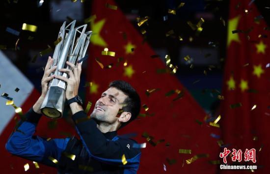 資料圖,小德第四次奪得上海網(wǎng)球大師賽的冠軍。圖為德約科維奇高舉獎(jiǎng)杯。湯彥俊 攝