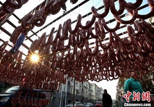 資料圖:“小雪”時節(jié) 南京街頭香腸成串。泱波 攝