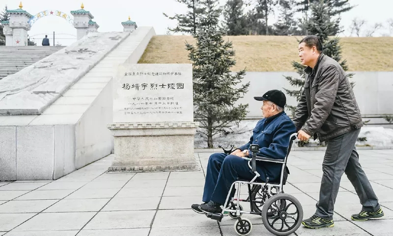 徐振明是吉林省通化市革命烈士陵園管理所首任所長,現(xiàn)年96歲。他先后參加過抗日戰(zhàn)爭、解放戰(zhàn)爭,1950年參加抗美援朝戰(zhàn)爭,曾榮立多次戰(zhàn)功。他退伍轉(zhuǎn)業(yè)到楊靖宇烈士陵園工作,父子兩代默默守護(hù)英雄陵墓60余年,身體力行保護(hù)革命遺跡,講述英雄故事,弘揚(yáng)革命精神。圖為徐振明(左)和兒子徐永軍來到楊靖宇烈士陵園。 新華社記者 王昊飛/攝