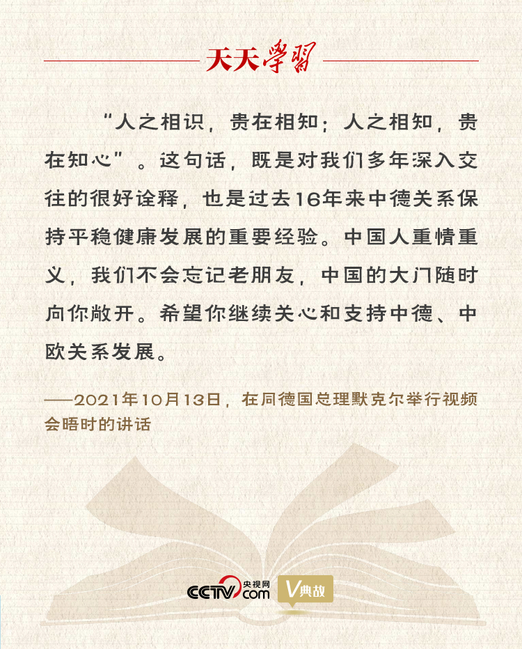 10月13日,習(xí)近平主席同德國(guó)總理默克爾舉行視頻會(huì)晤。雙方在友好的氛圍中回顧近年中德、中歐關(guān)系發(fā)展并就相關(guān)問題深入交換意見。習(xí)主席積極評(píng)價(jià)默克爾任內(nèi)為推動(dòng)中德、中歐關(guān)系發(fā)展所作的貢獻(xiàn),并引用“人之相識(shí),貴在相知;人之相知,貴在知心”,稱這句話“既是對(duì)我們多年深入交往的很好詮釋,也是過去16年來中德關(guān)系保持平穩(wěn)健康發(fā)展的重要經(jīng)驗(yàn)”。