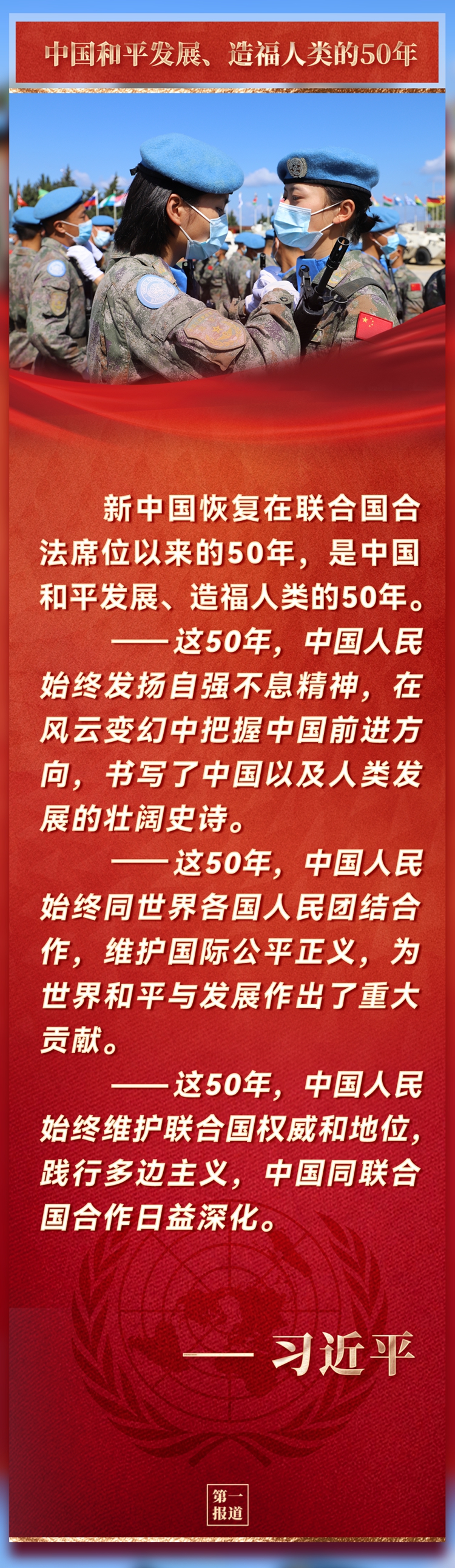 新中國(guó)恢復(fù)在聯(lián)合國(guó)合法席位以來(lái)的50年,是中國(guó)和平發(fā)展、造福人類(lèi)的50年。