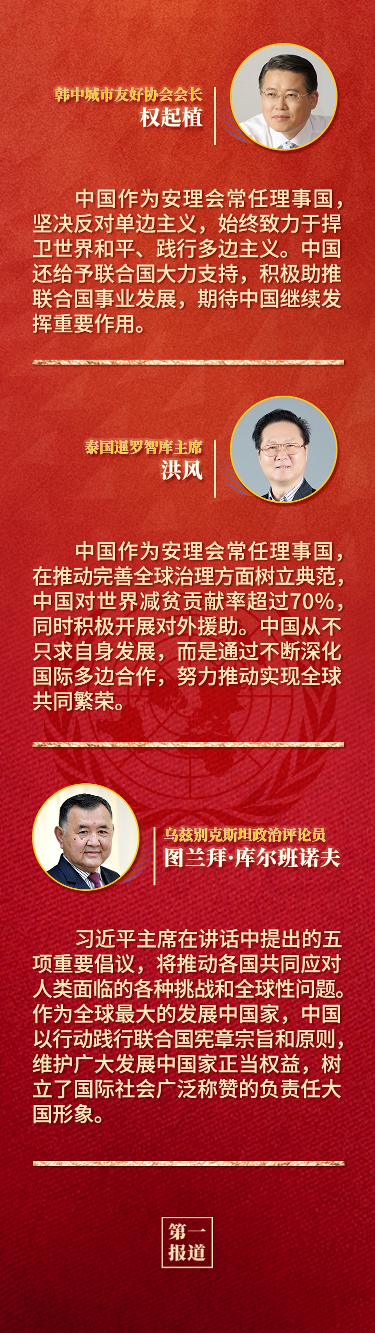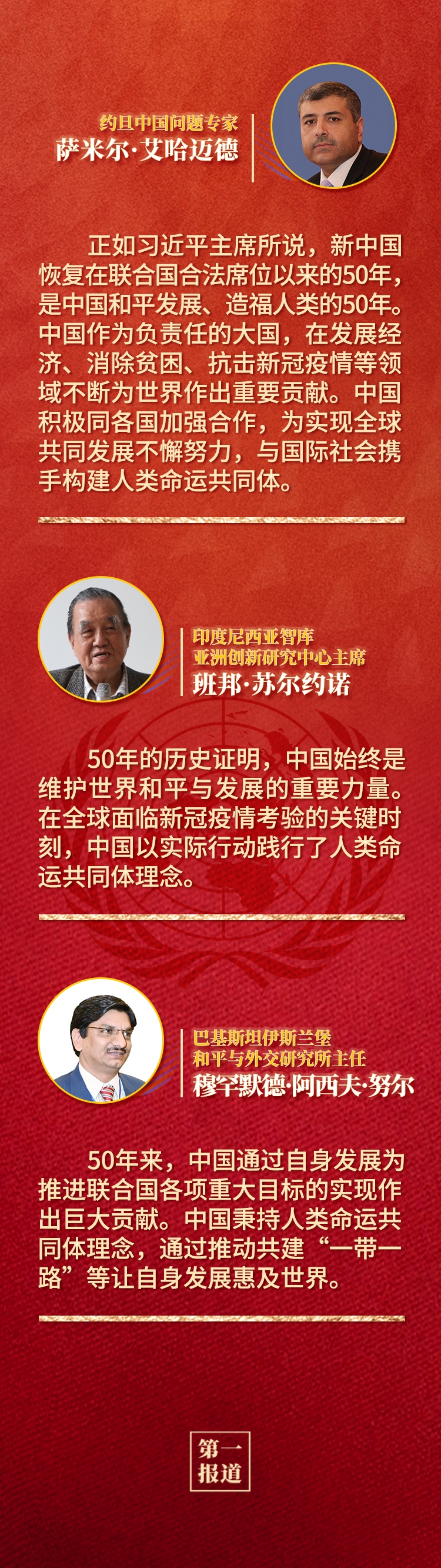 多國(guó)人士認(rèn)為,中華人民共和國(guó)恢復(fù)聯(lián)合國(guó)合法席位是世界和聯(lián)合國(guó)歷史上的一個(gè)大事件,習(xí)近平主席的重要講話回顧了中國(guó)和平發(fā)展、造福人類(lèi)的50年,為實(shí)現(xiàn)世界永續(xù)和平發(fā)展提出重要倡議,為全球共同推動(dòng)構(gòu)建人類(lèi)命運(yùn)共同體注入新的強(qiáng)大動(dòng)力。