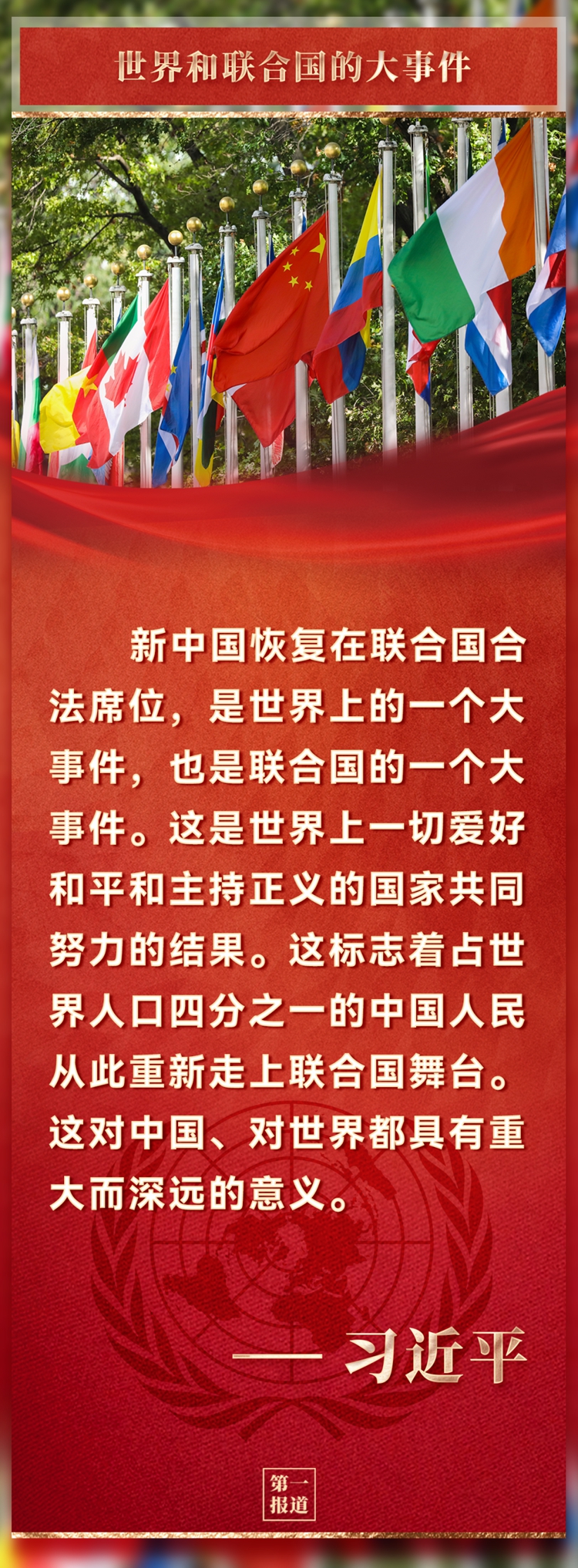 新中國(guó)恢復(fù)在聯(lián)合國(guó)合法席位,是世界上的一個(gè)大事件,也是聯(lián)合國(guó)的一個(gè)大事件。這是世界上一切愛(ài)好和平和主持正義的國(guó)家共同努力的結(jié)果。這標(biāo)志著占世界人口四分之一的中國(guó)人民從此重新走上聯(lián)合國(guó)舞臺(tái)。這對(duì)中國(guó)、對(duì)世界都具有重大而深遠(yuǎn)的意義。