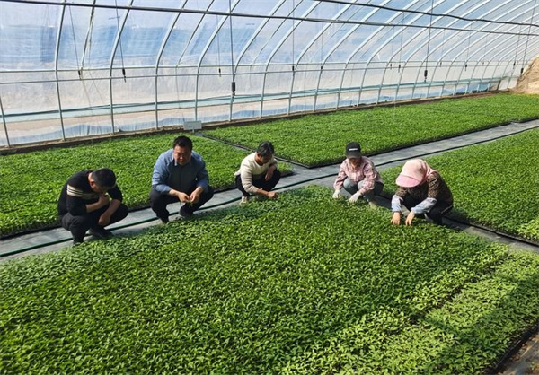 2023年4月30日,在甘肅省白銀市靖遠(yuǎn)縣東升鎮(zhèn),王定業(yè)(左二)與工作人員在大棚內(nèi)一同檢查種苗情況。新華社發(fā)