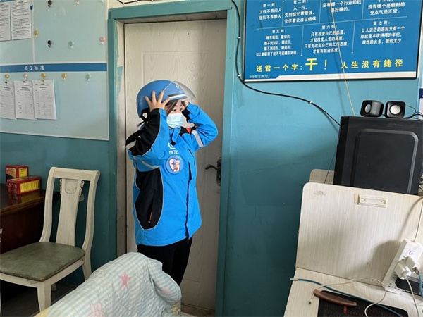 2023年4月24日,在寧夏銀川,外賣女騎手丁國(guó)梅在站點(diǎn)內(nèi)整理著裝,為即將到來(lái)的送餐高峰做準(zhǔn)備。新華社記者 任瑋 攝
