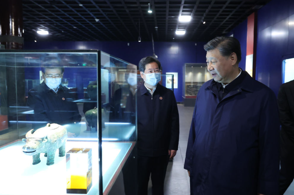 在河南安陽殷墟博物館,習近平總書記仔細觀摩青銅器、玉器、甲骨文等出土文物。“要通過文物發(fā)掘、研究保護工作,更好地傳承優(yōu)秀傳統(tǒng)文化。”