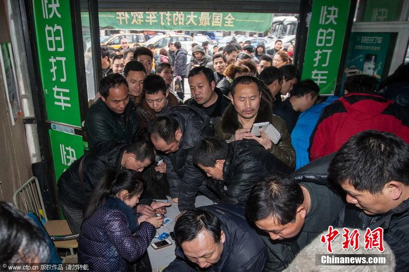 2014年2月19日,杭州,隨著“嘀嘀”、“快的”兩家打車軟件的“燒錢”競賽愈演愈烈,眾多出租車司機來到兩家打車軟件公司的杭州服務(wù)點,排隊安裝司機版軟件。司機們表示,安裝打車軟件,一是為了緊跟潮流方便做生意,二是可以得到更多的“獎勵”補貼。