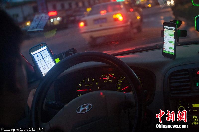 2014年2月19日,杭州,一位出租車(chē)司機(jī)同時(shí)開(kāi)著兩款打車(chē)軟件。圖片來(lái)源:CFP視覺(jué)中國(guó)5kE安康新聞網(wǎng)