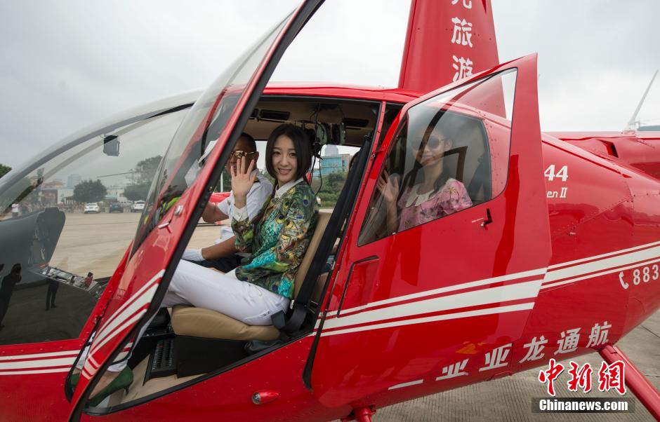 3月26日,隨著三亞亞龍通用航空公司的兩架紅色直升機(jī)在海南?谳d客啟航。標(biāo)志著低空觀光游覽項(xiàng)目正式進(jìn)駐海口,游客最低花費(fèi)500元人民幣即可體驗(yàn)低空飛行。據(jù)了解,這種由美國羅賓遜直升機(jī)公司生產(chǎn)的R44雷鳥II型直升機(jī),可乘坐4人(含飛行員),加滿油可以飛行兩個(gè)半小時(shí),航程約600公里。目前該公司在?谝呀(jīng)開辟了?谑袇^(qū)、世紀(jì)大橋、火山口、假日海灘、萬綠園等景點(diǎn)觀光飛行。圖為游客體驗(yàn)直升機(jī)低空旅游。中新社發(fā) 駱云飛 攝