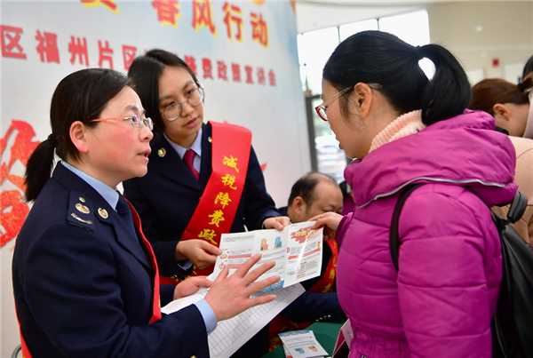 國(guó)家稅務(wù)總局福州經(jīng)濟(jì)技術(shù)開(kāi)發(fā)區(qū)稅務(wù)局工作人員,在馬尾區(qū)“減稅降費(fèi) 春風(fēng)行動(dòng)”宣講活動(dòng)現(xiàn)場(chǎng)為一家企業(yè)的出納(右一)講解稅收優(yōu)惠政策(2月25日攝)。 新華社……