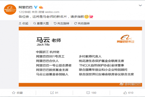 阿里巴巴官方曬馬云新名片:共計11個頭銜