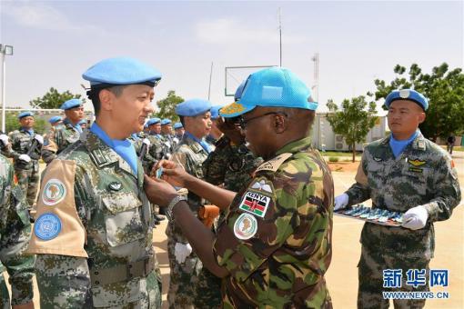 7月15日,在蘇丹達爾富爾法希爾,聯(lián)合國和非洲聯(lián)盟駐達爾富爾聯(lián)合特派團(聯(lián)非達團)部隊司令恩貢迪中將(右二)把勛章佩戴在中國維和官兵胸前。中國首支維和直……