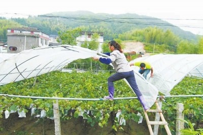 臺風(fēng)“蘇迪羅”造成福安多個鄉(xiāng)鎮(zhèn)的葡萄園進(jìn)水、大棚損壞。圖為連日來,松羅鄉(xiāng)尤沃村果農(nóng)加緊搶修葡萄園避雨大棚。何小麗 鄭祖輝 攝“蘇迪羅”卷走!