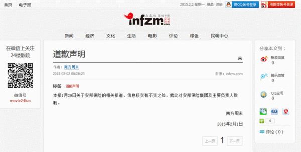 南方周末凌晨就安邦保險報道發(fā)道歉聲明
