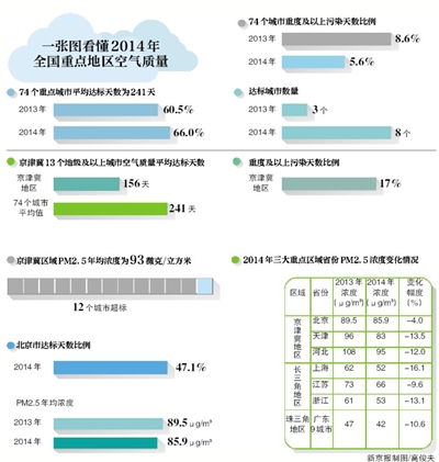新京報訊 (記者金煜) 環(huán)保部昨日公布了去年重點區(qū)域和74個城市空氣質(zhì)量狀況。去年全國PM2.5濃度有了普遍下降,京津冀區(qū)域PM2.5年均濃度降到93微克/立方米,雖然……