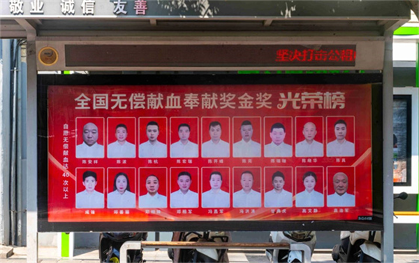 在第22個世界獻血者日到來之際,安康市中心血站精心策劃,自6月中旬起,在位于市政務大廳、市中心醫(yī)院、市中心醫(yī)院北院區(qū)門前的三處公交候車亭,以及中心城區(qū)兩處LED大屏上,全天循環(huán)展播著安康市榮獲“全國無償獻血奉獻獎”終身榮譽獎、金獎、銀獎、銅獎的獲獎者代表風采照片。UWe安康新聞網(wǎng)