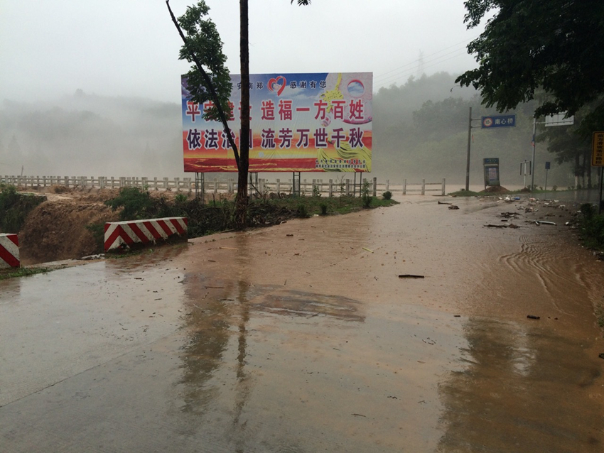 6月28日,南鄭縣牟家壩鎮(zhèn),洪水沖過南心橋,漫上公路記者 曾春 攝